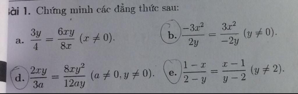 e) Có$\frac{1-x}{2-y}$ =-(-$\frac{1-x}{2-y}$)=-($\frac{-(1-x)}{2-y}$)=-($\frac{x-1}{2-y}$)=$\frac{x-1}{-(2-y)}$=$\frac{x-1}{y-2}$