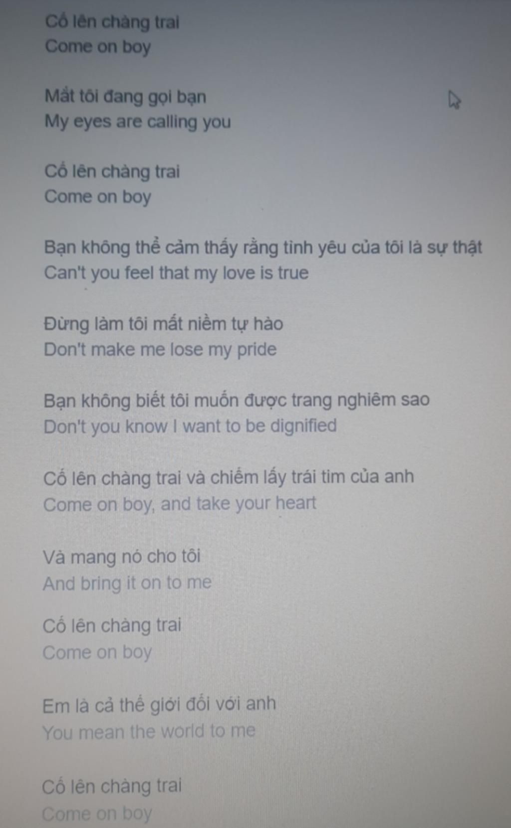 Ừ! Haha! Chúng tôi là Clinah! C L I N A H vâng! (L O V E) I Love you boy boy (C O M E) Nào Nào Nào Nào Nào Nào (L O V E) I Love you boy boy C O M E vâng! Neoman bomyeon dugeun daeneun tôi neukkimi nan joha Niga nareul bomyeon nuneul eodi dulji nan molla Hanbeon dubeon, sebeon tto nebeon, jakku bogopa Ilbun ibun, sanbun tto sabun, jakku saenggak na Joha handago, maeil saenggak nan dago Naege dagawa, naemam nunchi chae jullae Này, cố lên cậu bé (Cậu bé!) Cố lên cậu bé (Cậu bé!) Cố lên cậu bé (Cậu bé!) Nae soneul jaba jugetni, haru jongil Gidarineun na egero Cố lên cậu bé (Cậu bé!) Cố lên cậu bé (Cậu bé!) Cố lên cậu bé (Cậu bé!) Neon naemam aneunji moreu neunji, moreun che hajima Ije namja dabge naegero Come on boy (L O V E) I Love you boy boy (C O M E) Nào Nào Nào Nào Nào Nào (L O V E) I Love you boy boy C O M E vâng! Oneul haru do neottaemune gibuni joha Ije buteo naemam nunchi chae jullae Hanbeon dubeon, sebeon tto nebeon, jakku bogopa Ilbun ibun, sanbun tto sabun, jakku saenggak na Joha handago, jakku saenggak nan dago Naege dagawa, nareul ana ju getni Này, cố lên cậu bé (Cậu bé!) Cố lên cậu bé (Cậu bé!) Cố lên cậu bé (Cậu bé!) Nae soneul jaba jugetni, haru jongil Gidarineun na egero Cố lên cậu bé (Cậu bé!) Cố lên cậu bé (Cậu bé!) Cố lên cậu bé (Cậu bé!) Neon naemam aneunji moreu neunji, moreun che hajima Ije namja dabge naegero Come on boy Này, nào cậu bé, Cố lên cậu bé, Cố lên cậu bé Nareul kkok ana jullae, haru jongil Gidarineun na egero Này, cố lên cậu bé (Cậu bé!) Cố lên cậu bé (Cậu bé!) Cố lên cậu bé (Cậu bé!) Neon jeongmal aneunji moreu neunji, moreun che hajima Ije namja dabge naegero Come on boy (L O V E) Chúng tôi là Clinah! (C O M E) Nào Nào Nào Nào Nào Nào (L O V E) Hanbeon deo Clinah! C L I N A H Yeah!