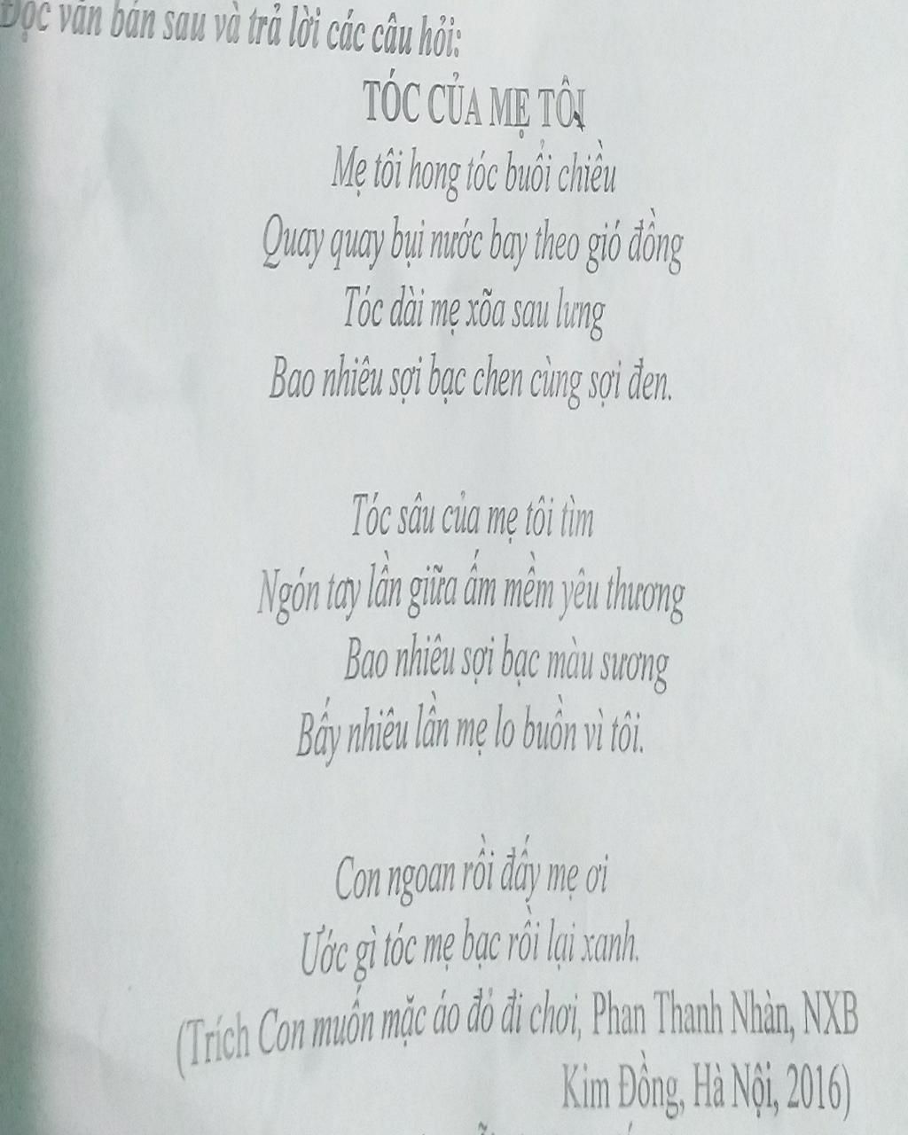 Bài thơ "Tóc của mẹ tôi" khiến em dâng trào những cảm xúc khó tả về sự hy sinh thầm lặng của mẹ. Mỗi sợi tóc bạc trong bài thơ không chỉ là dấu hiệu của thời gian mà còn là minh chứng cho những nỗi lo, những vất vả mà mẹ đã trải qua vì con. Đọc bài thơ, em cảm nhận được tấm lòng bao la và sự hi sinh của mẹ, và càng thêm yêu quý mẹ hơn bao giờ hết. Mong muốn của em là sẽ cố gắng học tập thật tốt, sống có ích để mẹ bớt lo lắng, chăm sóc mẹ nhiều hơn trong những năm tháng mẹ đã dành cả đời cho con. Em sẽ luôn là niềm vui và nguồn động lực của mẹ để mái tóc mẹ không phải thêm sợi bạc nào nữa.