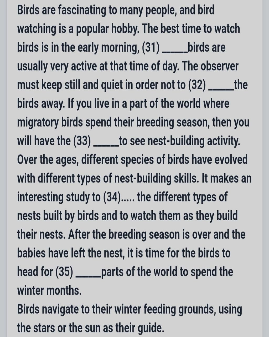 Birds are fascinating to many people, and bird watching is a popular hobby. The best time to watch birds is in the early morning, because birds are usually very active at that time of the day. The obsever must keep still and quiet in order not to frighten the birds away. If you live in a part of the world where migratory birds spend their breeding season, then you will have the prospect to see nest-building activity. It makes an interesting study to look at the different types of nests built by birds and to watch them as they built their nests. After the breeding season is over and the babies have left the nest, it is time for the birds to head for cooler parts of the world to spend the winter months. Birds navigate to their winter feeding ground, using the stars or the sun as their guide.