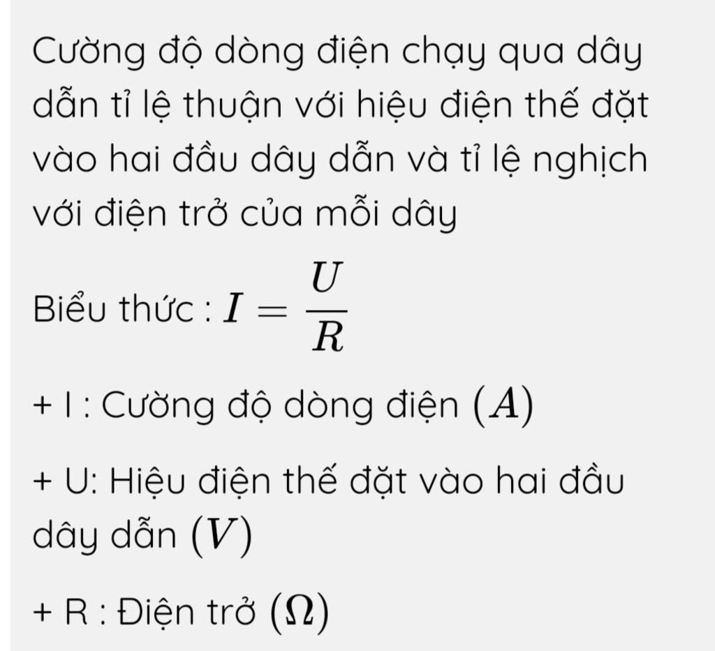 Cường độ dòng điện chạy qua dây dẫn tỉ lệ thuận với hiệu điện thế đặt vào hai đầu đoạn dây và tỉ lệ nghịch với điện trở của dây.