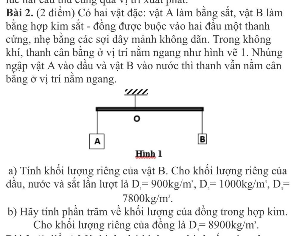 Khi nhúng chìm vật $A$ vào dầu, vật $B$ vào nước, theo điều kiện cân bằng của đòn bẩy, ta có: