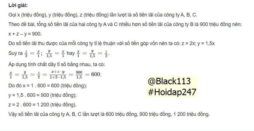 Ba công ty A, B, C thỏa thuận góp vốn để mở rộng sản xuất. Số tiền công ty C góp vốn gấp đôi số tiền công ty A góp vốn. Số tiền công ty B góp vốn gấp rưỡi số tiền công ty A góp vốn. Tính số liền lai của mỗi công ty, biết rằng số tiền lãi thu được của mỗi công ty tỉ lệ thuận với số tiền góp vốn và tổng số tiền lãi của hai công ty A và C nhiều hơn số tiền lãi của công ty B là 900 triệu đồng.