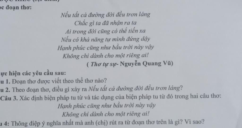 Câu 4: Thông điệp ý nghũa nhất: Hạnh phúc luôn ở bên ta chỉ cần ta luôn cố gắng, vươn lên, tiến xa, đứng dậy và hành động.