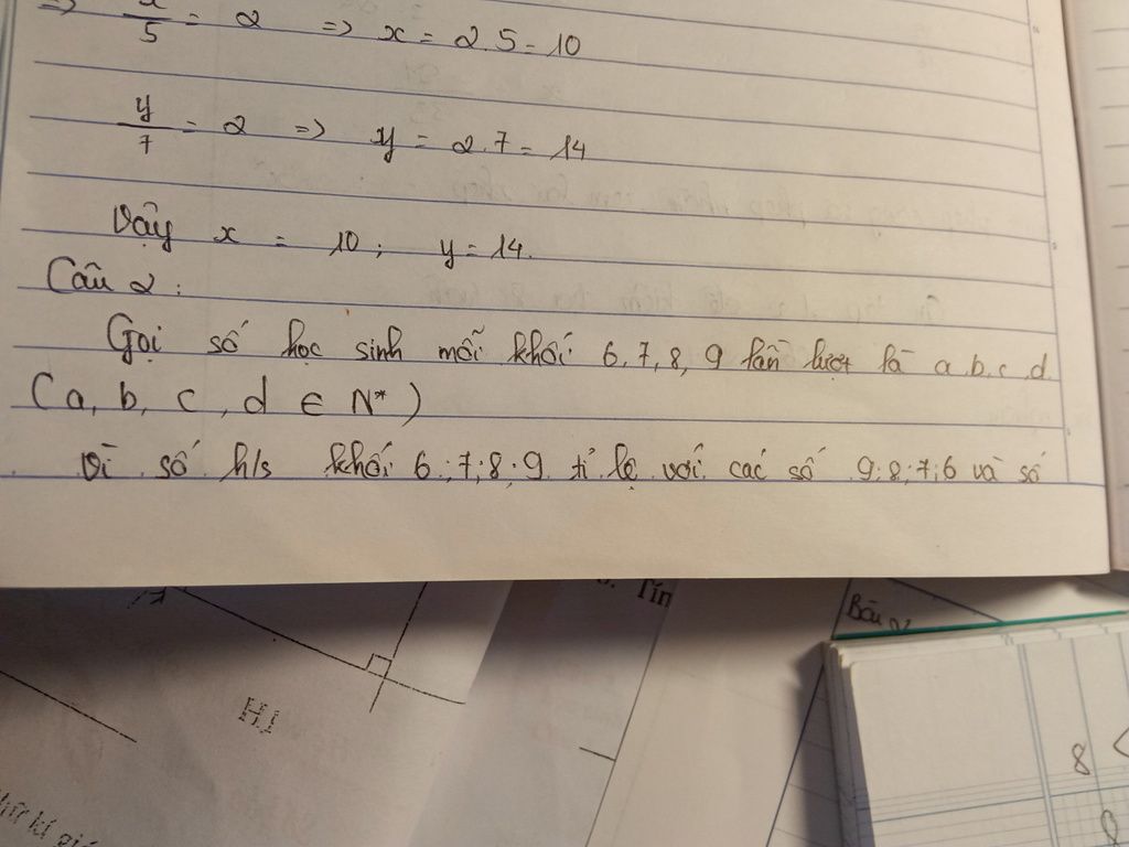 Gọi a,b,c,d lần lượt là số học sinh của 4 khối 6,7,8,9 tỉ lệ với 9,8,7,6