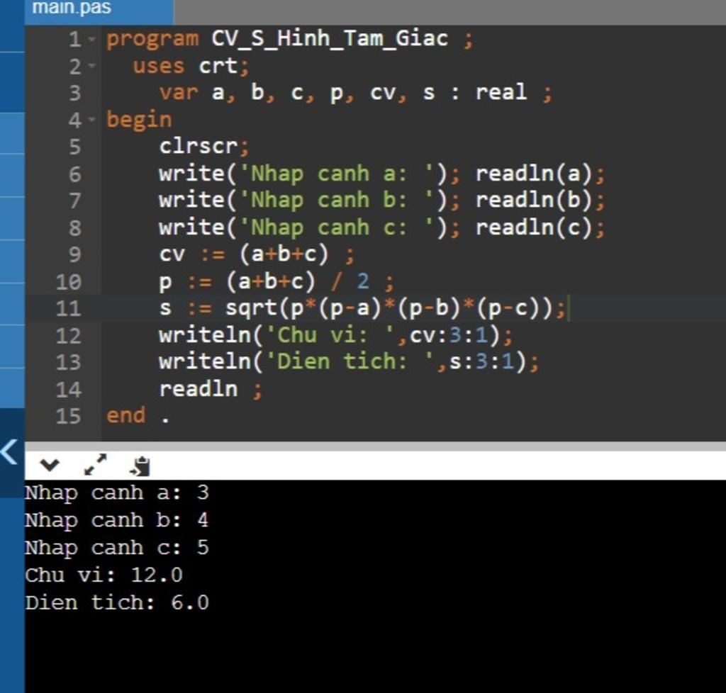 writeln('Dien tich hinh tam giac la: ',S:4:2);