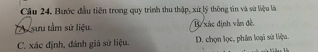 `@` Bước đầu tiên trong quy trình thu thập, xử lý thông tin và sử liệu là : Xác định vấn đề.