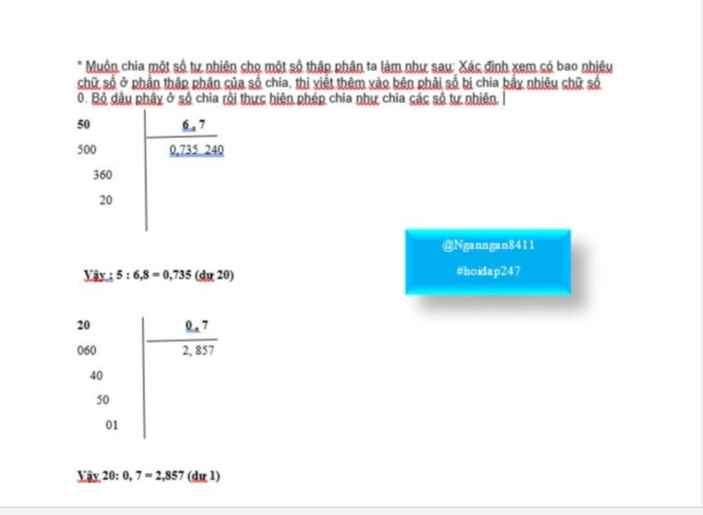 Vậy `20 : 7 = 2,85 (dư 0,05)`