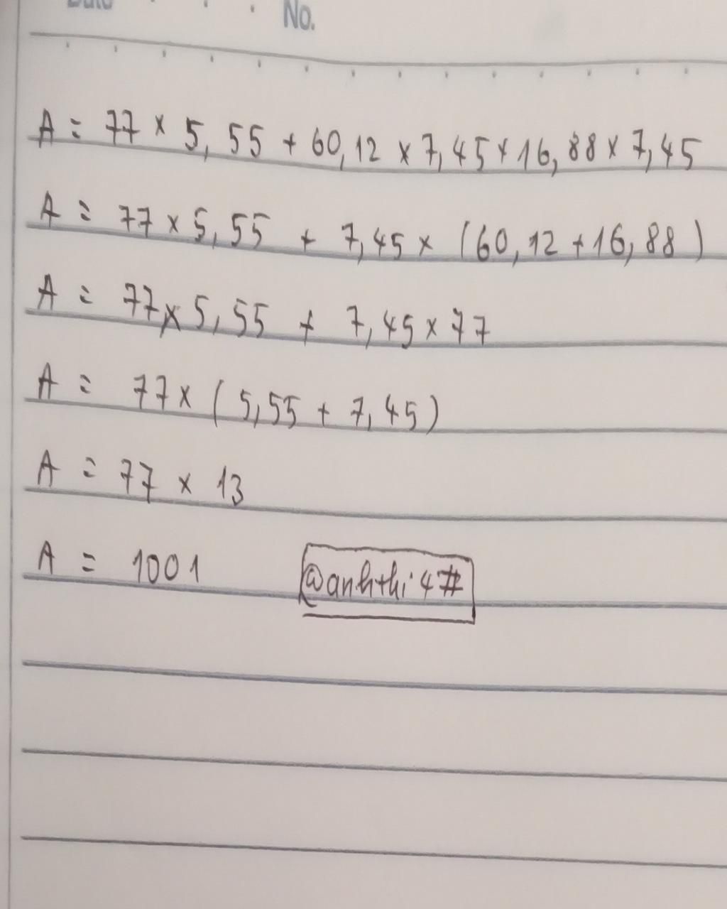 `A= 77 xx (5,55+7,45)`