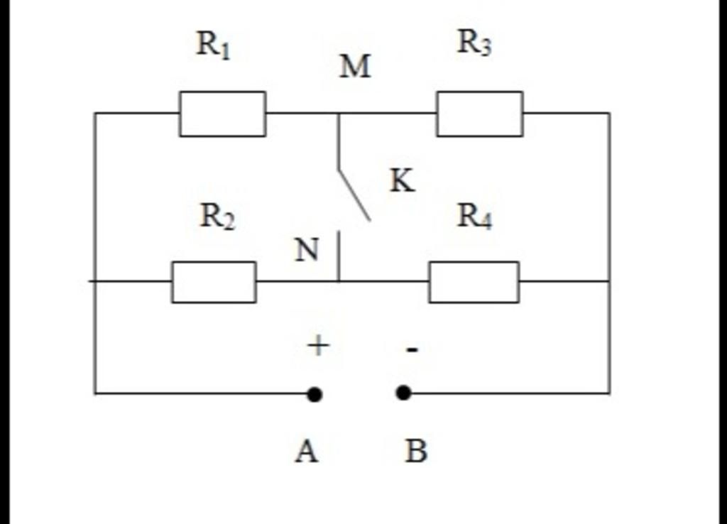 b) K đóng, ta có mạch: $(R_1//R_2)nt(R_3//R_4)$