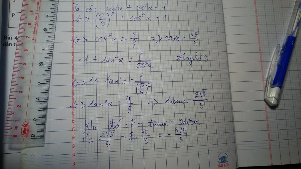 Ta có $sin^{2}$a + $cos^{2}$a $\text{=1}$ $\\$ $\text{=> cosa=$\sqrt{1-(\dfrac{2}{3})^2}$}$=$\dfrac{\sqrt{5}}{3}$ $\\$ $\text{có tan a= $\dfrac{sina}{cosa}$}$ =$\text{$\dfrac{2}{3}$:$\dfrac{\sqrt{5}}{3}$=$\dfrac{2\sqrt{5}}{5}$}$ $\\$ $\text{P=tana-3cosa}$ $\\$ $\text{ $\dfrac{2\sqrt{5}}{5}$-3.$\dfrac{\sqrt{5}}{3}$=$\dfrac{2\sqrt{5}}{5}$-$\sqrt{5}$=$\dfrac{2\sqrt{5}}{5}$-$\dfrac{5\sqrt{5}}{5}$=-$\dfrac{3\sqrt{5}}{5}$}$ $\\$ $\underline{RinzHice}$