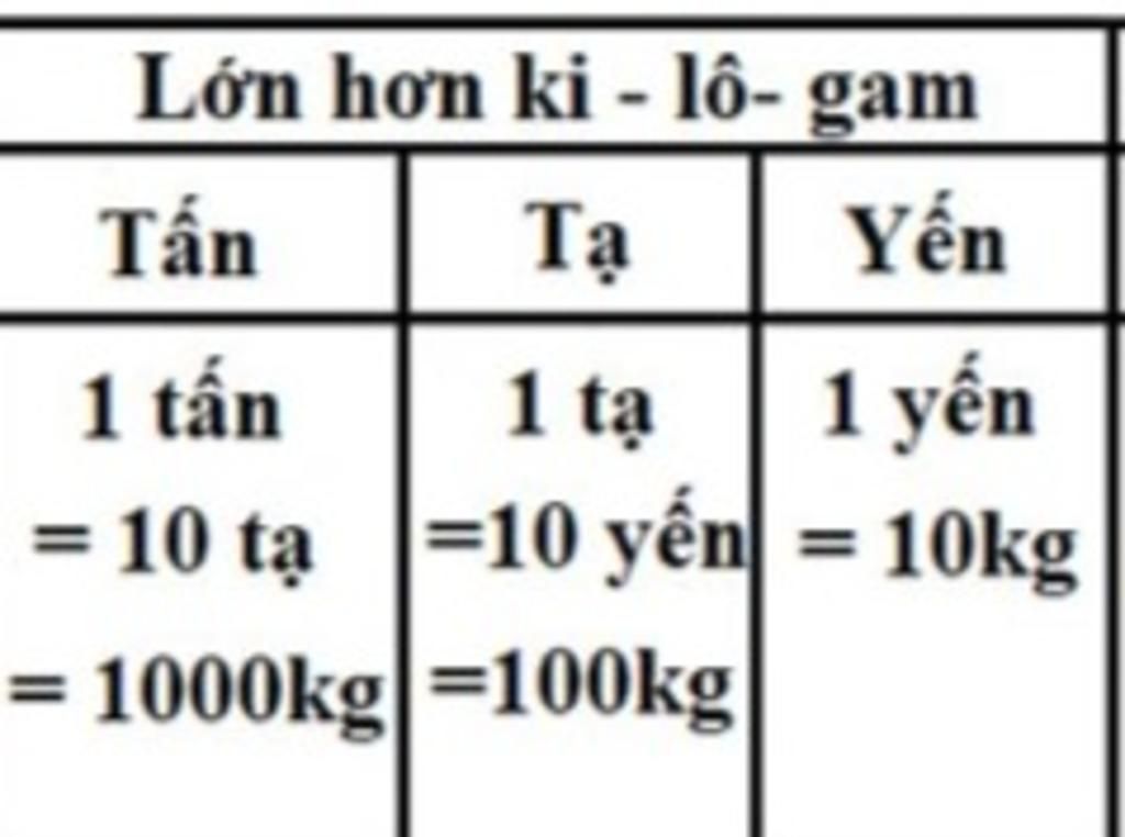 `=> 1/4` tấn `= 100 xx 1/4 = 25` yến.