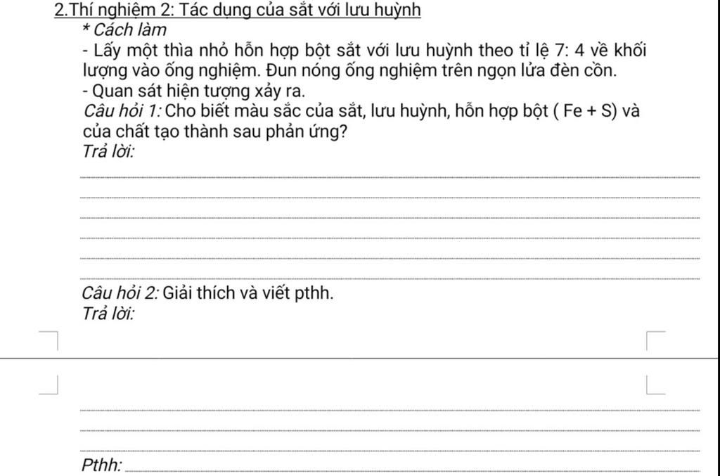 Hiện tượng: Khi đun hỗn hợp trên ngọn lửa đèn cồn, sắt tác dụng mạnh với lưu huỳnh hỗn hợp cháy nóng đỏ, phản ứng toả nhiều nhiệt.