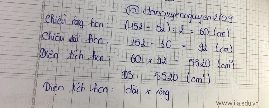 Một tấm hình bìa chữ nhật có nửa chu vi là 152cm ,chiều rộng kém chiều dài 32cm.Tính diện tích hình chữ nhật đó