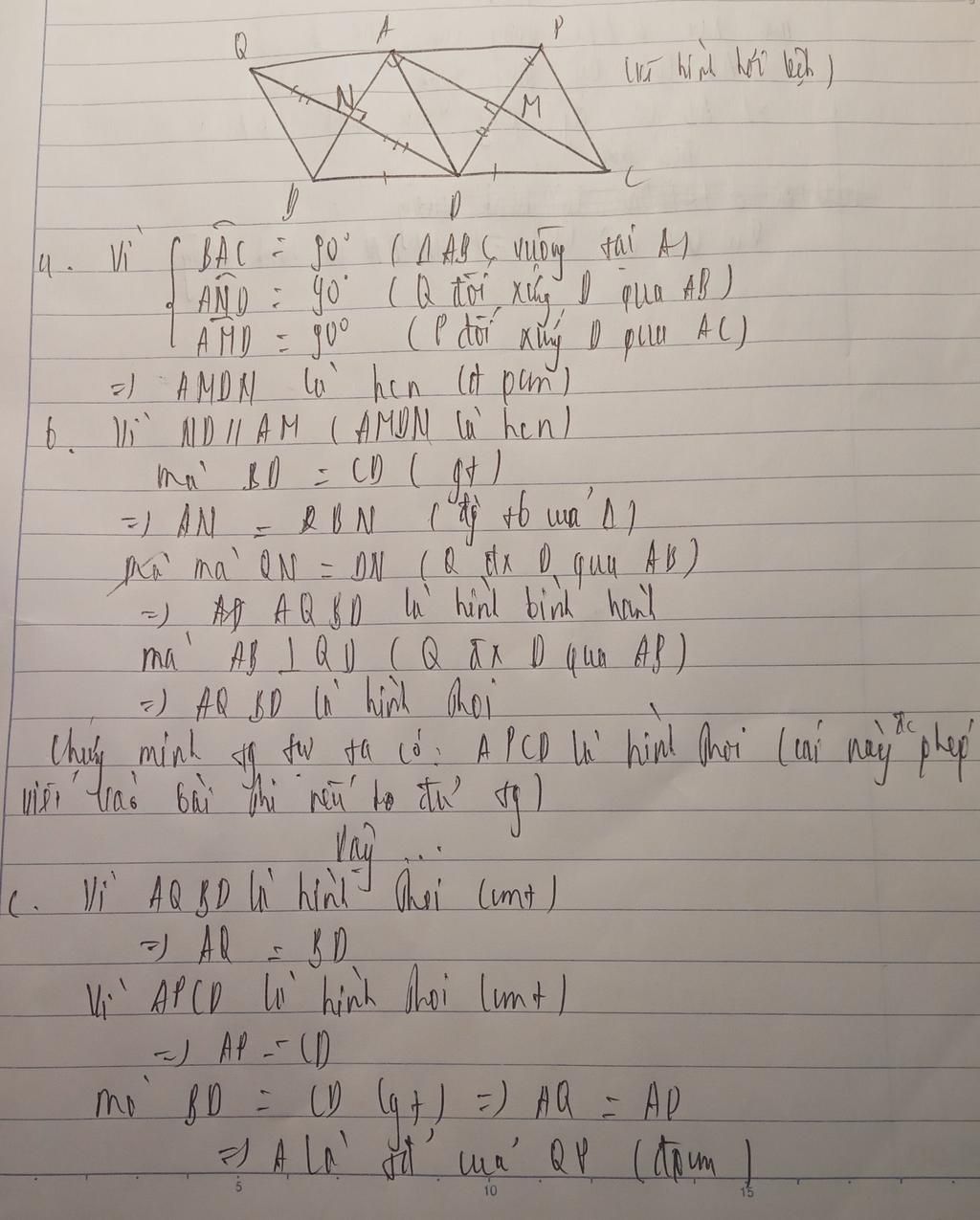 Cho Tam Giác ABC vuông tại A trung tuyến AD.Gọi P,Q theo thứ tự là điểm đối xứng với D qua AC,AB.Gọi M là giao điểm của DP và AC,N là giao điểm của DQ và AB.