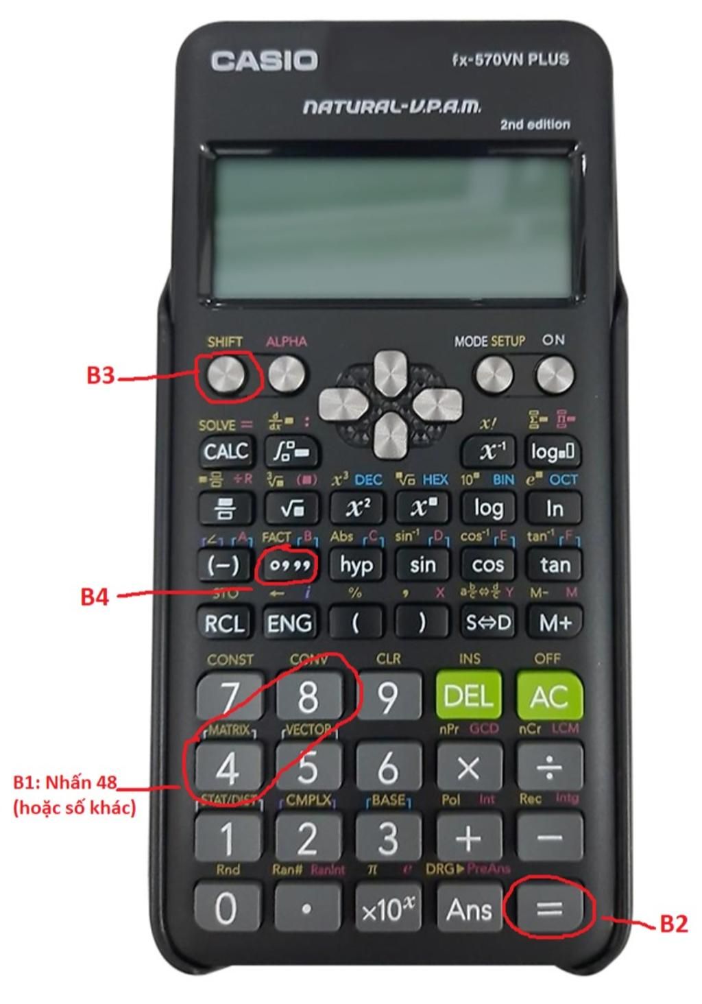 Bấm `48``->` Bấm dấu "="`->` Bấm Shift `->` Bấm Fact ( Ô có chữ Fact màu vàng )