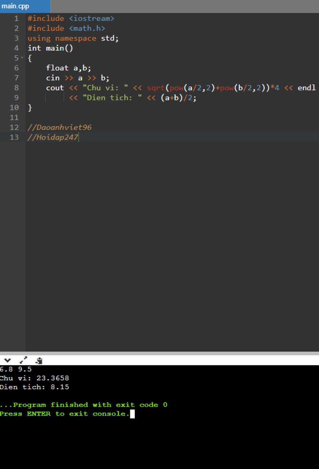 cout << "Chu vi: " << sqrt(pow(a/2,2)+pow(b/2,2))*4 << endl