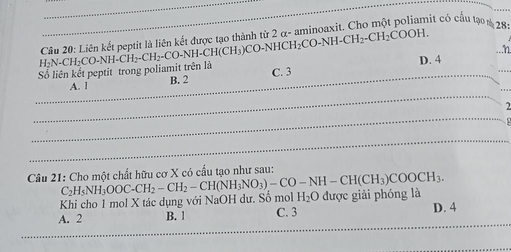 Trong poliamit có $4$ nhóm amit, trong đó có $3$ liên kết tạo bởi $NH_2-CH_2-CH_2-COOH$ (không là $\alpha-$aminoaxit) nên có $4-3=1$ liên kết peptit.