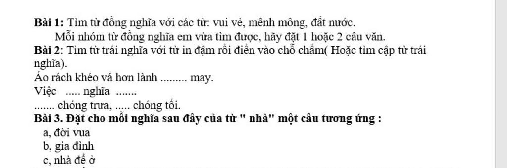 $\text{Từ đồng nghĩa với vui vẻ, mênh mông, đất nước lần lượt là : hạnh phúc, bát ngát, xã tắc.}$
