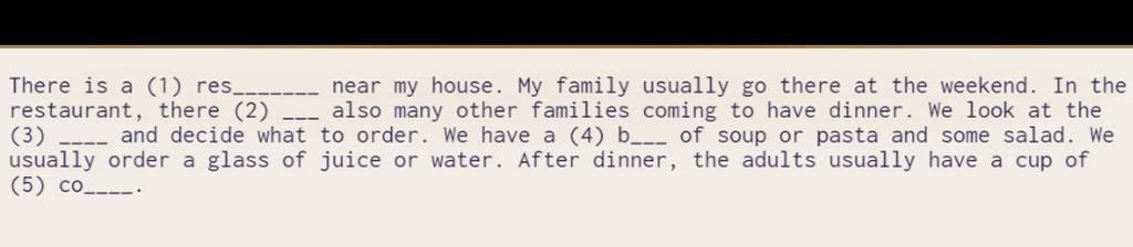 (3) and decide what to order. We have a (4) b___ of soup or pasta and some salad. We