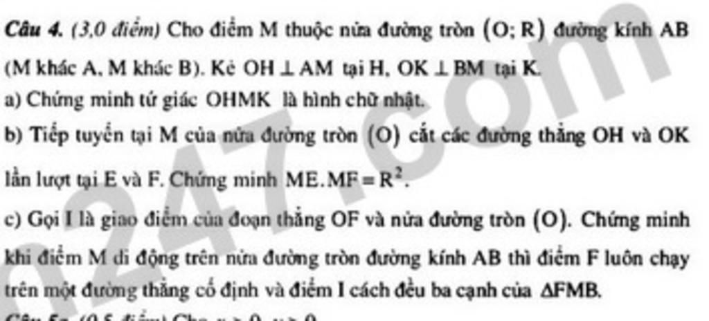 Câu 4. (3,0 điểm) Cho điểm M thuộc nửa đường tròn (O;R) đường kính AB