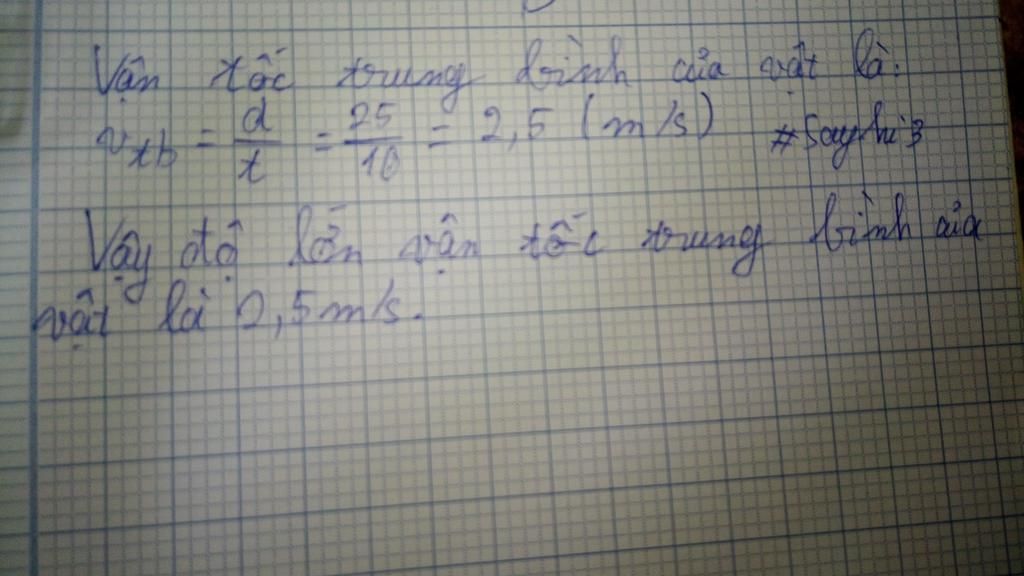 Một vật chuyển động thẳng, độ dịch chuyển của trong khoảng thời gian 10 s có độ lớn 25 m. Tính độ lớn vận tốc trung bình của vật trong khoảng thời gian đó.