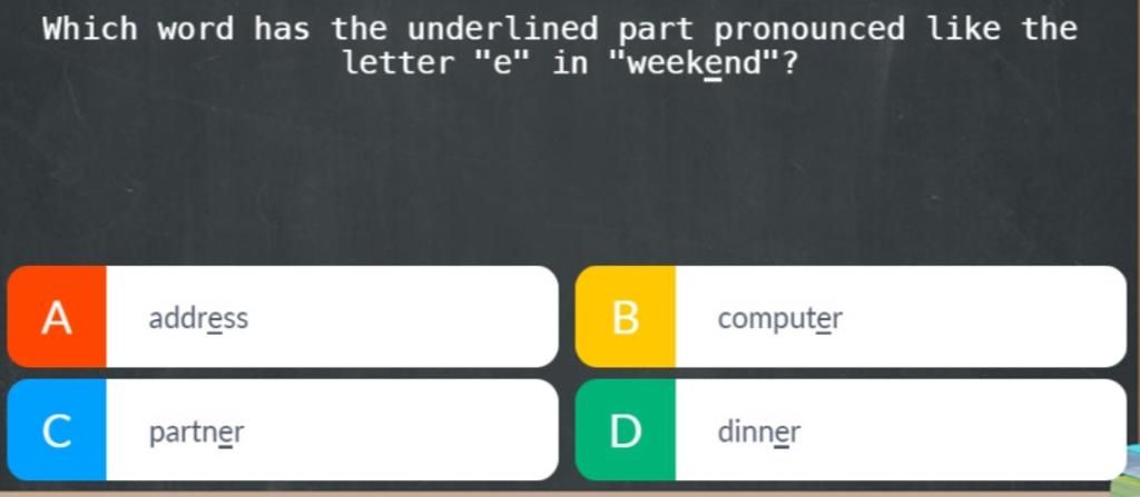 $\\$`⇒` Tạm dịch đề bài: Từ nào có phần gạch chân được phát âm giống chữ "e" trong từ weekend?