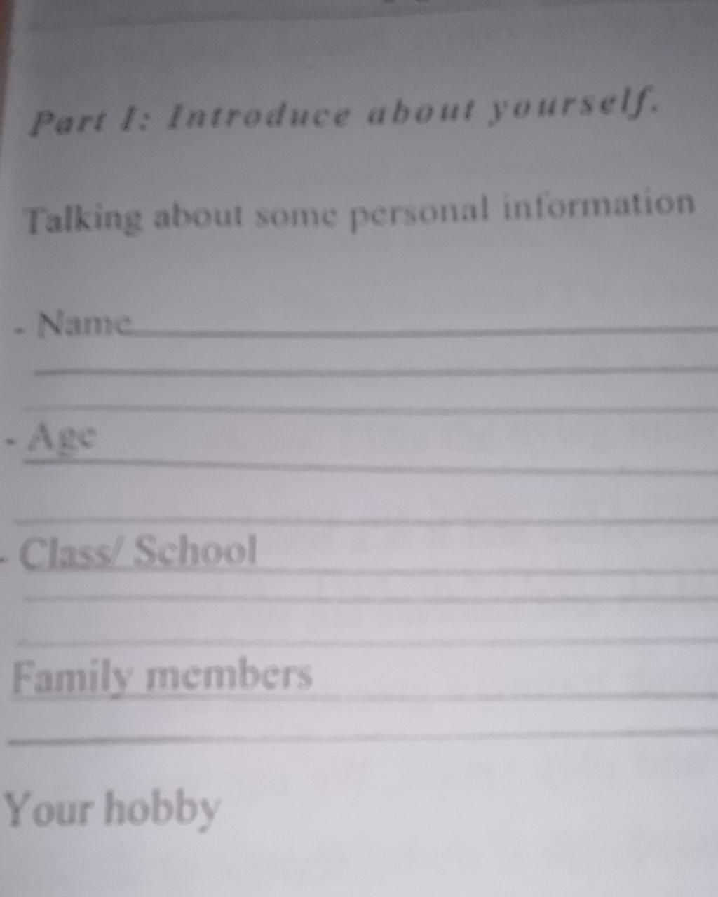 Tôi tên là dũng. Tôi 13 tuổi. Tôi học lớp 8/5 trường THCS Phan Chu Trinh. Có 4 người trong gia đình tôi: bố, mẹ, tôi và em gái. Sở thích của tôi là đọc sách.