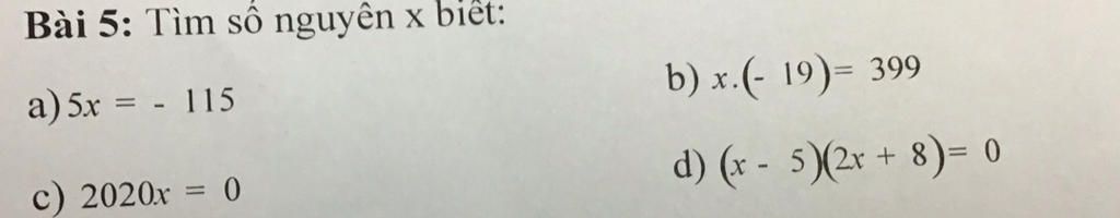 Giải thích các bước giải: Bài 5:Tìm số nguyên x biết: