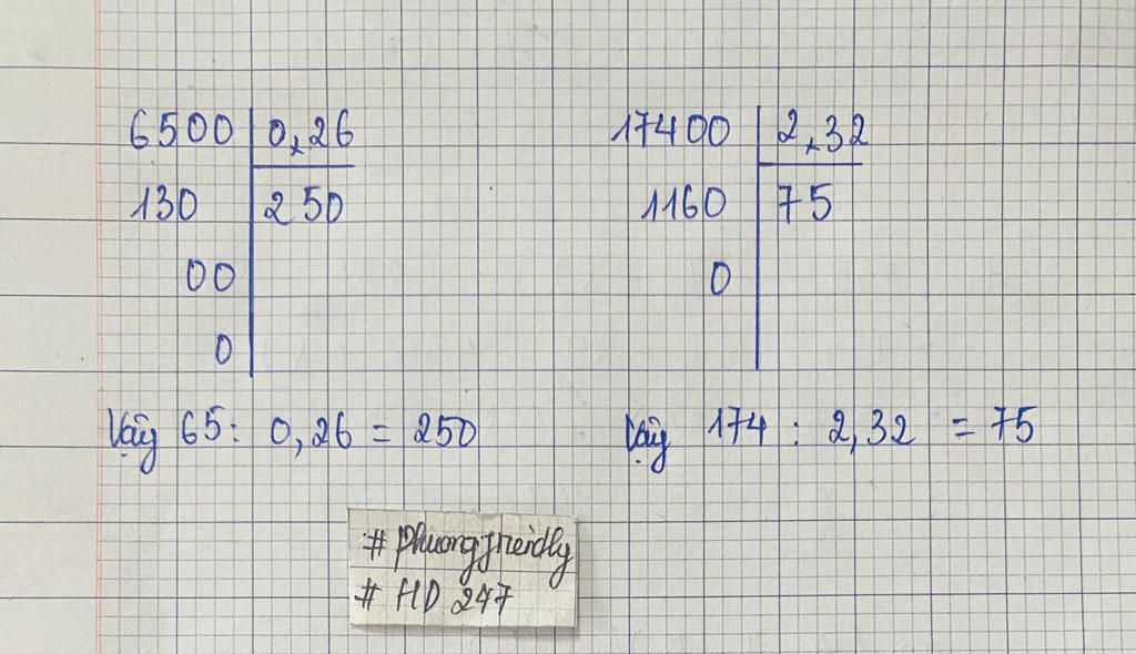 (Hai phép tính này đều có 2 số thập phân ở phần thập phân của số chia, nên ta viết thêm vào bên phải số bị chia 2 chữ số 0.)