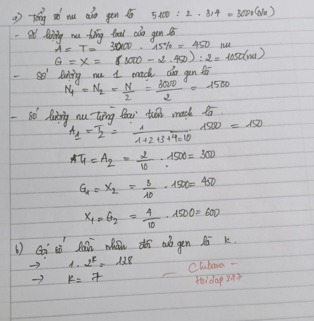 b) gen trên tự nhân đôi một số lần đã tạo ra các gen mới với tổng số mạch con là 128, vậy gen trên nhân đôi bao nhiêu lần?