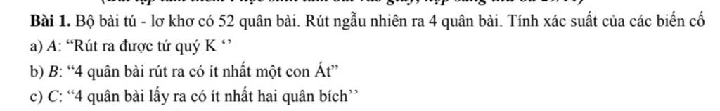 Bài 1. Bộ bài tú - lơ khơ có 52 quân bài. Rút ngẫu nhiên ra 4 quân bài. Tính xác suất của các biến cố