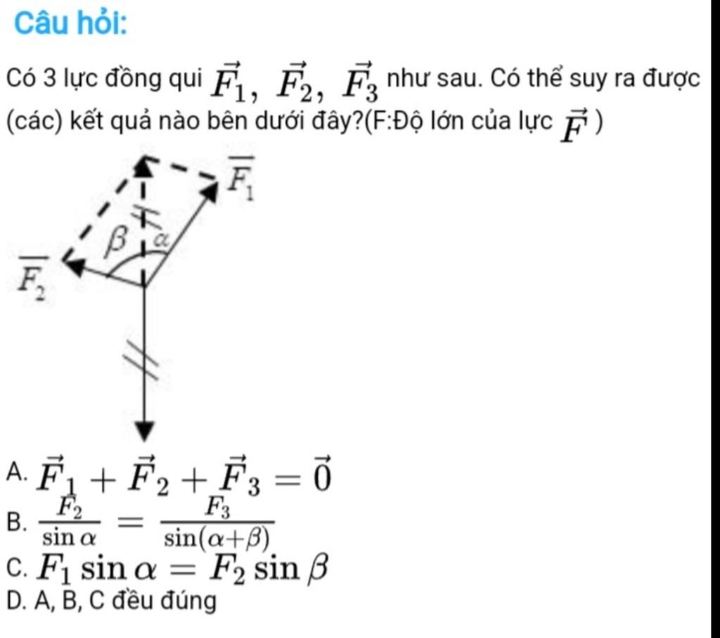 ⇒ `F_1\sin\alpha=F_2\sin\beta`