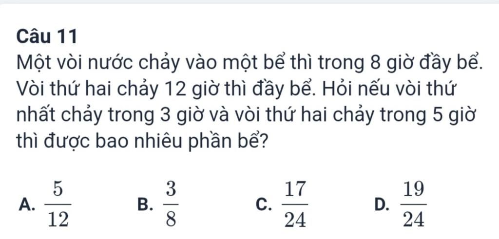 $\textit{$\frac{3}{8}$ + $\frac{5}{12}$ = $\frac{19}{24}$ (phần bể)}$