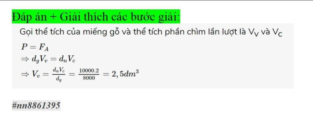 $\\$ Vậy thể tích của khối gỗ là `0,0025m^3`