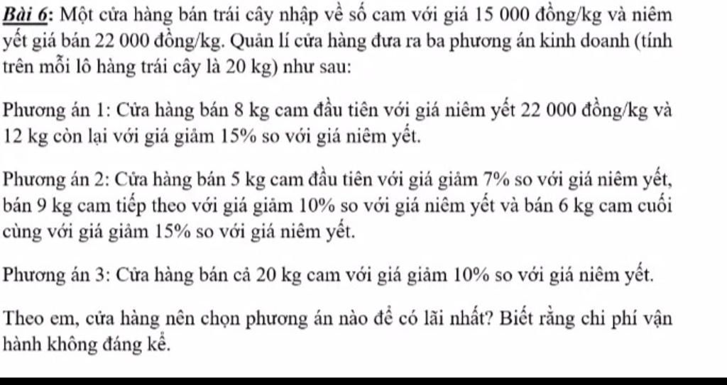 Giá bán của 5kg cam đầu tiên sau khi giảm 7% so với giá niêm yết là: