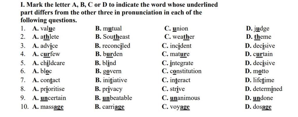 10. A. (Phát âm /ɑ:ʒ/ còn lại âm /ɪdʒ/)