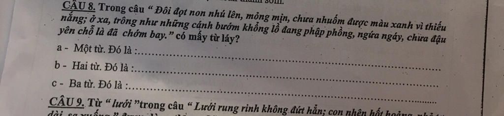 Câu 8. Trong cậu ''Đôi đọt non nhú lên, mỏng mịn, chưa nhuốm được màu xanh vì thiếu nắng; ở xa, trông như những cánh bướm khổng lồ đang phập phồng, ngứa ngáy, chưa đậu yên chỗ là đã chớm bay.” có mấy từ láy?