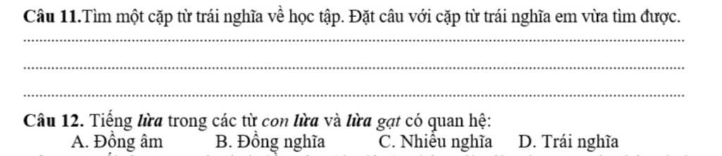 - Ta loại `D` vì từ trái nghĩa là những từ có nghĩa trái ngược nhau. Mà từ con lừa và lừa gạt không có nghĩa trái ngược nhau nên ta loại `D`