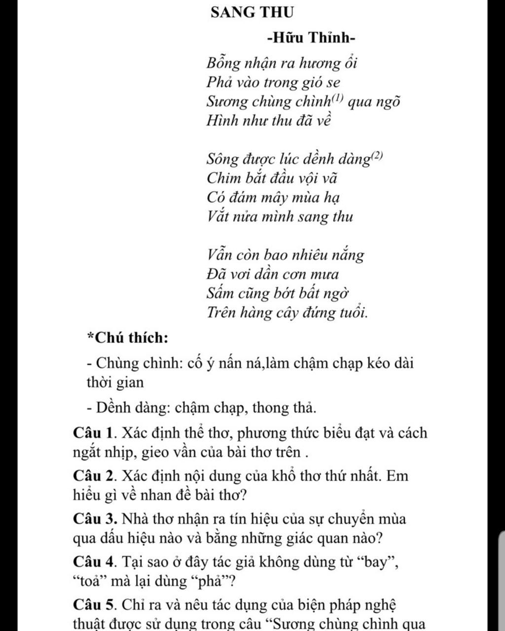 câu 1 : xác định thể thơ , phương thức biểu đạt và cách ngắt nhịp gieo vần của bài thơ sang thu