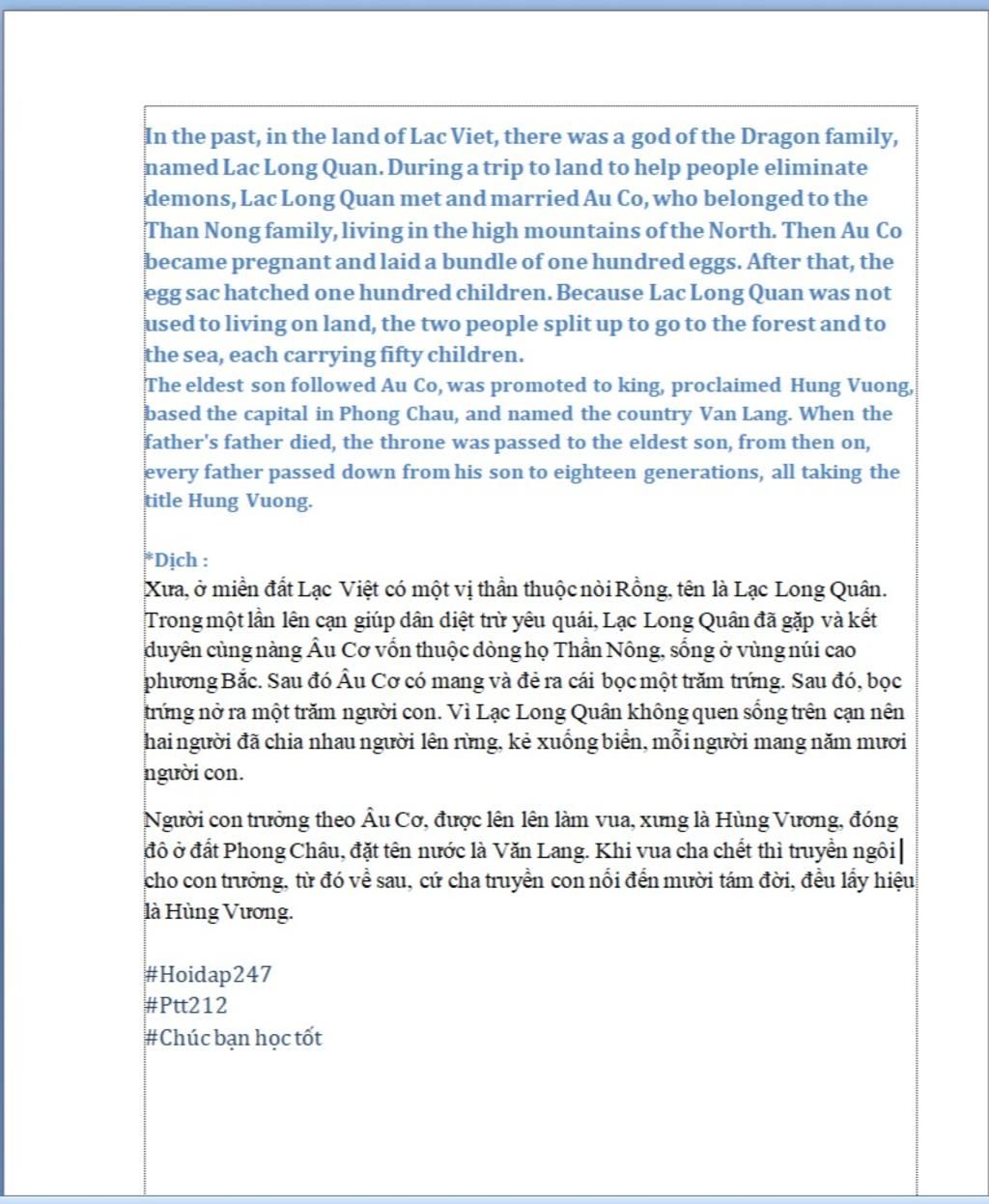Once upon a time in the land of Lac Viet, there was a god, the son of God Long Nu, named Lac Long Quan, and Au Co of the beautiful Shen Nong family. Later, Au Co gave birth to a bag of hundreds of eggs, from a hundred eggs hatched a hundred handsome and handsome children. Because Lac Long Quan was not used to living on land for a long time, the couple each took fifty children to the forest and into the sea. The eldest son was honored as King Hung in Phong Chau, named the country Van Lang, and so on for all generations to come.