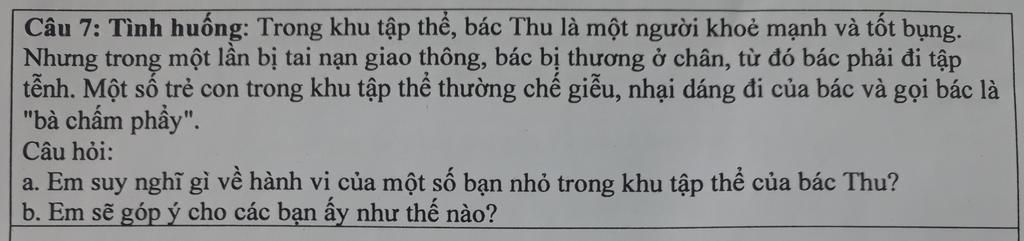 b, Các bạn không nên làm như vậy , vì làm vậy sẽ khiến bác Thu buồn . Ví dụ như các bạn giống như bác Thu chân đi tập tễnh như vậy thì các bạn sẽ cảm thấy như thế nào . Vậy nên các bạn đừng chế giễu Bác như vậy.