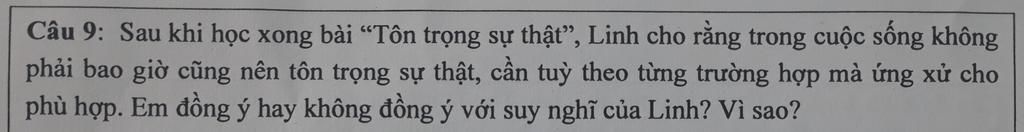 Em đồng ý với ý kiến của Linh vì có những lúc chúng ta phải nói không đúng sự thật để khích lệ người khác , tránh nói thắng vào các vấn đề đau thương . Nhưng chúng ta không được lừa dối bản thân mình và đôi lúc cần phải thành thật để phát triển tốt đẹp hơn