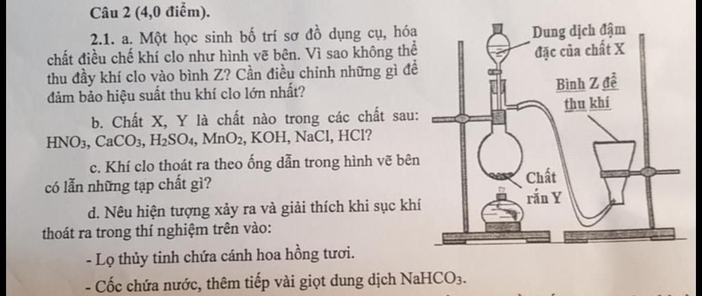 Không thể thu đầy khí clo vào bình $Z$ do khí clo nặng hơn không khí nên để đáy bình hướng lên làm cho khí clo tràn ra ngoài. Muốn hiệu suất thu khí clo lớn nhất, phải để ngửa bình, đáy bình hướng xuống.