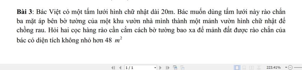 Bài 3: Bác Việt có một tấm lưới hình chữ nhật dài 20m. Bác muốn dùng tấm lưới này rào chắn