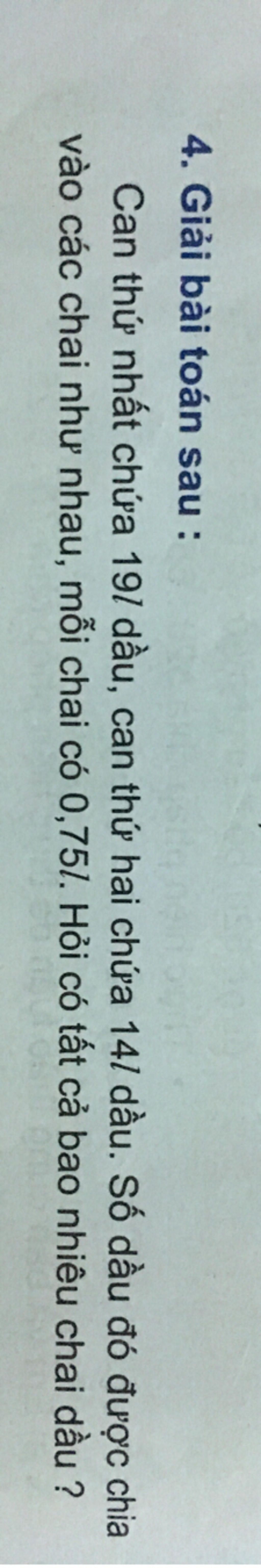 Can thứ nhất chứa 19l dầu,can thứ 2 chứa 14l dầu .số dầu đó được chia vào các chai như nhau,mỗi chai có o,75l.hỏi có tất cả bao nhiêu chai dầu