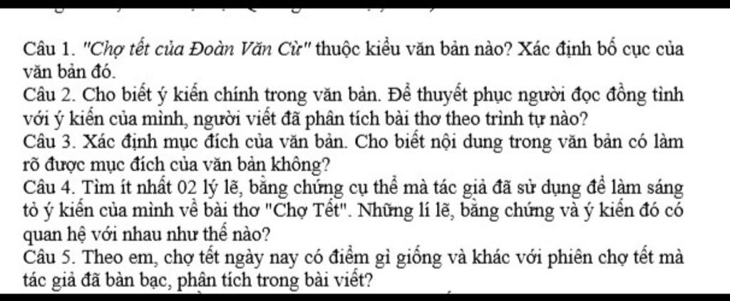 Câu 1. "Chợ tết của Đoàn Văn Cừ" thuộc kiểu văn bản nào? Xác định bố cục của