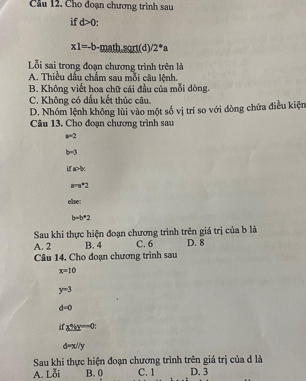Câu 12. Cho đoạn chương trình sau