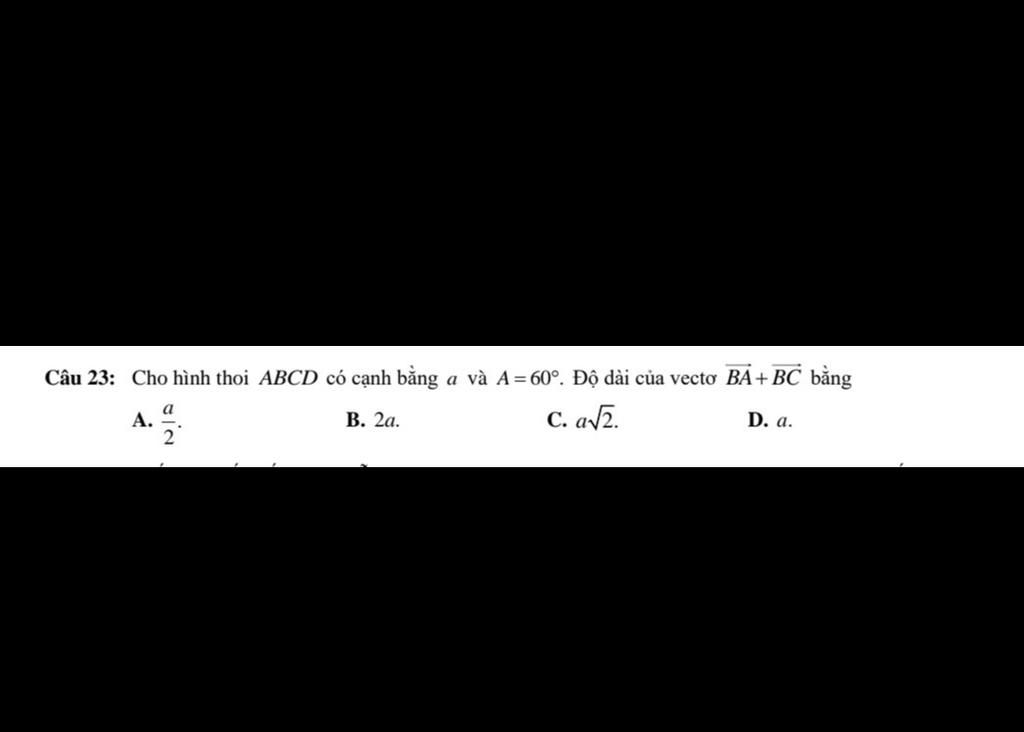 \Leftrightarrow \left| {\overrightarrow {BA} + \overrightarrow {BC} } \right| = \left| {2\overrightarrow {BO} } \right| = 2.\dfrac{1}{2}a = a