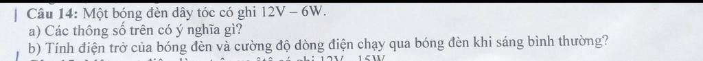 a. Bóng đèn hoạt động bình thường khi có dòng điện có Hiệu điện thế là `12` Vôn chạy qua. Khi ấy, nó hoạt động với Công suất tiêu thụ là `6` Oát